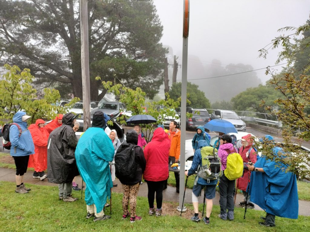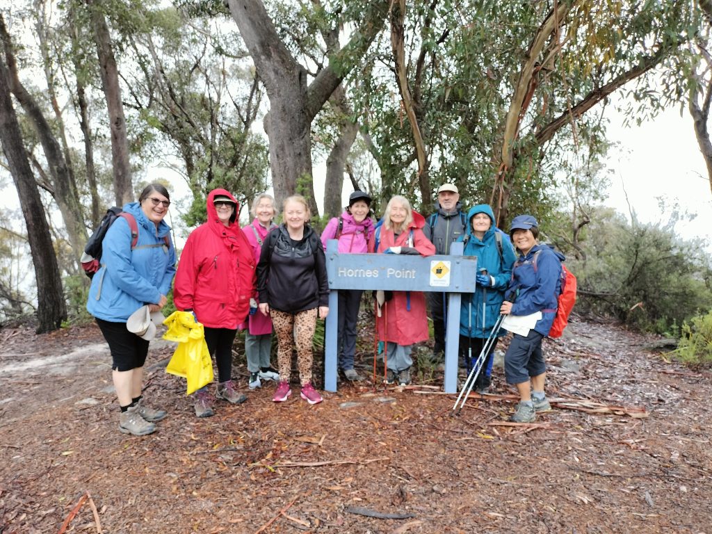 A group of 16 walkers joined the medium walk to visit a number of the scenic lookouts around Mount Victoria. The day started off misty and drizzly with little hope of seeing any views. We were however not discouraged and with colourful raingear on set off to Hornes Point.